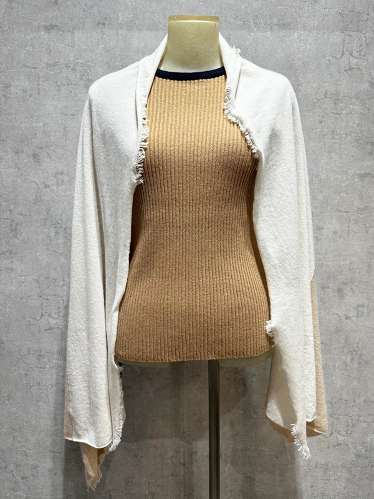 カシミヤの特徴を最大限に引き出す為、国内最古の伝統を誇る東洋紡糸の26番単糸を使用し、限りなくスローに編上げ、縮絨((しゅくじゅう)繊維に圧力をかけ、組織を結合させ厚みや強度を増やす加工)仕上げを行い、フェルト状の肉厚感があり、暖かく軽やかな仕上がりに。独特の質感がリュクスなムードを演出。一点投入するだけでコーディネートがぐっとこなれた印象になります。
