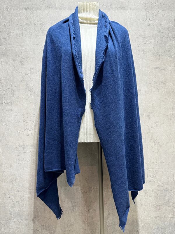 カシミヤの特徴を最大限に引き出す為、国内最古の伝統を誇る東洋紡糸の26番単糸を使用し、限りなくスローに編上げ、縮絨((しゅくじゅう)繊維に圧力をかけ、組織を結合させ厚みや強度を増やす加工)仕上げを行い、フェルト状の肉厚感があり、暖かく軽やかな仕上がりに。独特の質感がリュクスなムードを演出。一点投入するだけでコーディネートがぐっとこなれた印象になります。