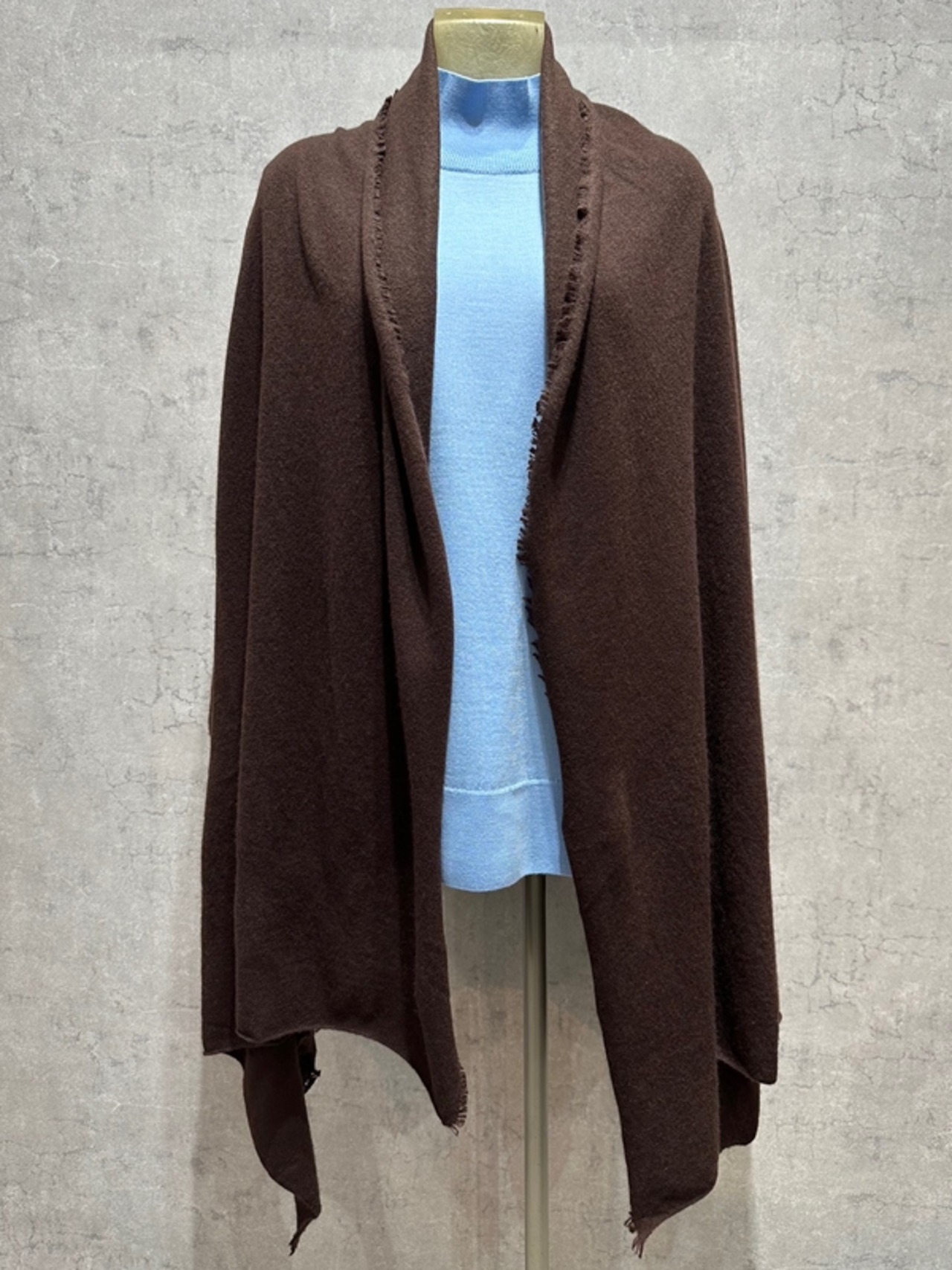 カシミヤの特徴を最大限に引き出す為、国内最古の伝統を誇る東洋紡糸の26番単糸を使用し、限りなくスローに編上げ、縮絨((しゅくじゅう)繊維に圧力をかけ、組織を結合させ厚みや強度を増やす加工)仕上げを行い、フェルト状の肉厚感があり、暖かく軽やかな仕上がりに。独特の質感がリュクスなムードを演出。一点投入するだけでコーディネートがぐっとこなれた印象になります。