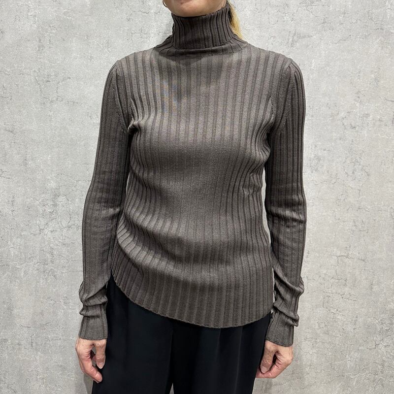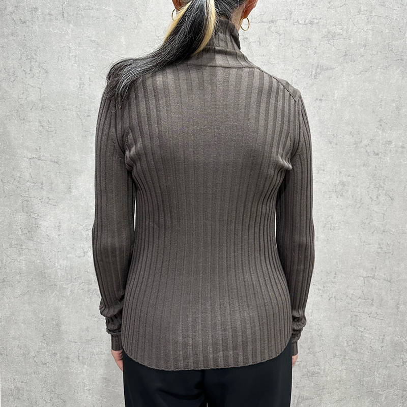 際立つ編地の綺麗さ、柔らかで滑らかな肌触り、微妙な光沢感が絶妙な風合いを醸し出す品の良さが大人のデイリー使いに嬉しいアイテム。総リンキング仕上げで、薄すぎず厚すぎず程良い肉厚が安心・安定感をもたらします。リブ素材の程よいフィット感が女性らしいシルエットを演出。シンプルなデザインで合わせるものを選ばないからデイリーに大活躍してくれそう。様々なサイズの方に対応できるワイドリブニット。