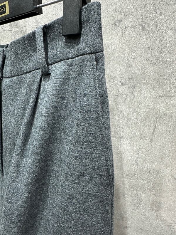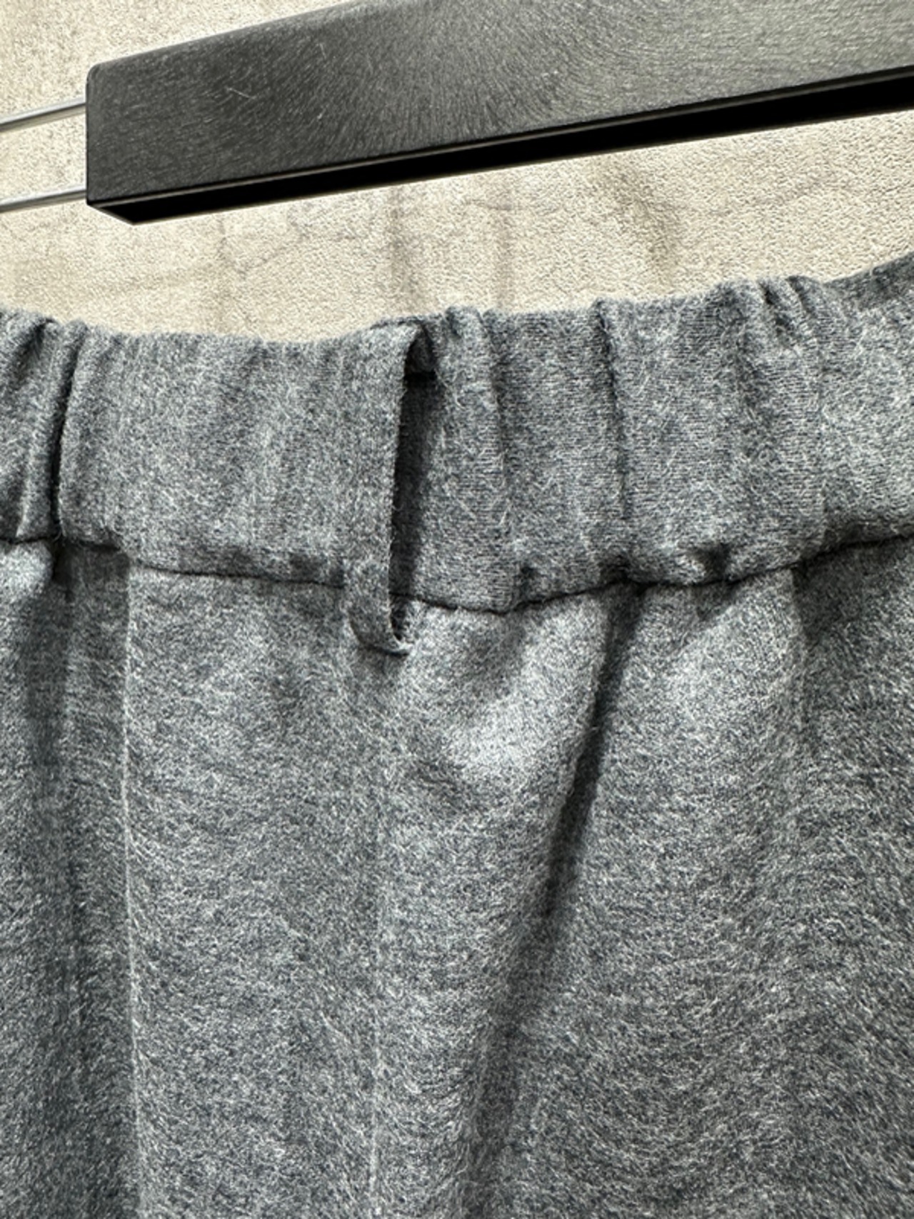 ジェームスジャージー高級糸「SUPER100原料72番双糸」を使用したワイドパンツ。ハイゲージで編んだ天竺組織をさらに圧縮し、ミルド加工を施すことで保温性を高め、まるでウールフランネルのように温かみのある仕上がりに。股上を深めにとり、ウエスト後ろゴム仕様、タックデザインで安心の履き心地を実現。脚のラインを拾わないワイドレッグがキレイめスタイルをアシスト。シリーズのジャケットとセットアップもオススメです。